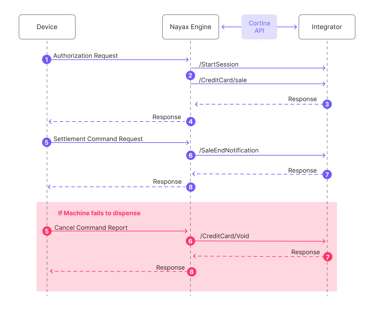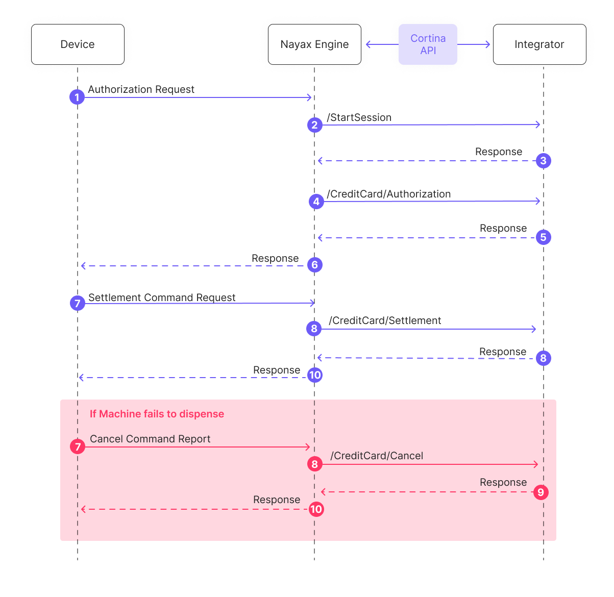 - The Nayax Engine receives the Authorization Response from the Cortina API and returns it to the Device. If approved, the device proceeds with the transaction and prepares to dispense the product.
