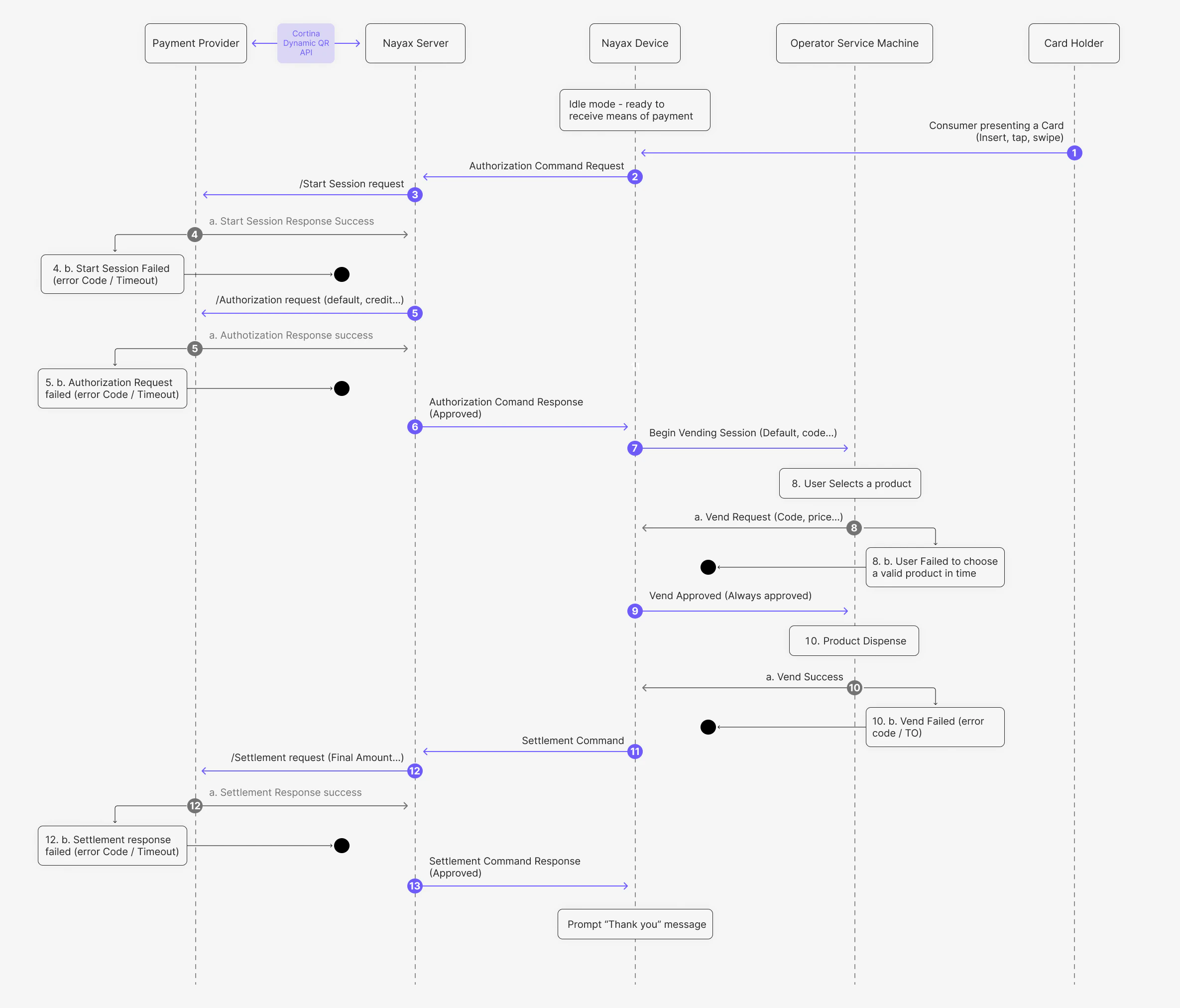 | Vend Failed | 9.b | If the machine fails to dispense the product (e.g., mechanical jam) after a successful sale, the Nayax Engine triggers the Credit Card Void endpoint to reverse the transaction. |