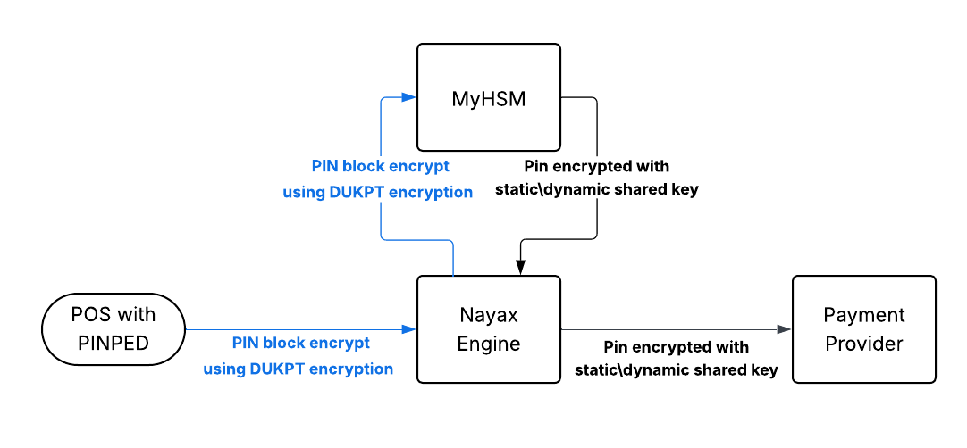 Nayax supports two methods for PIN key exchange and encryption:- Manual Key Exchange (Static Key): In this approach, the PIN is encrypted using a long-term cryptographic key known as a Zone PIN Key (ZPK). The ZPK is securely exchanged during the setup phase and is manually loaded into the MyHSM system in accordance with PCI requirements.