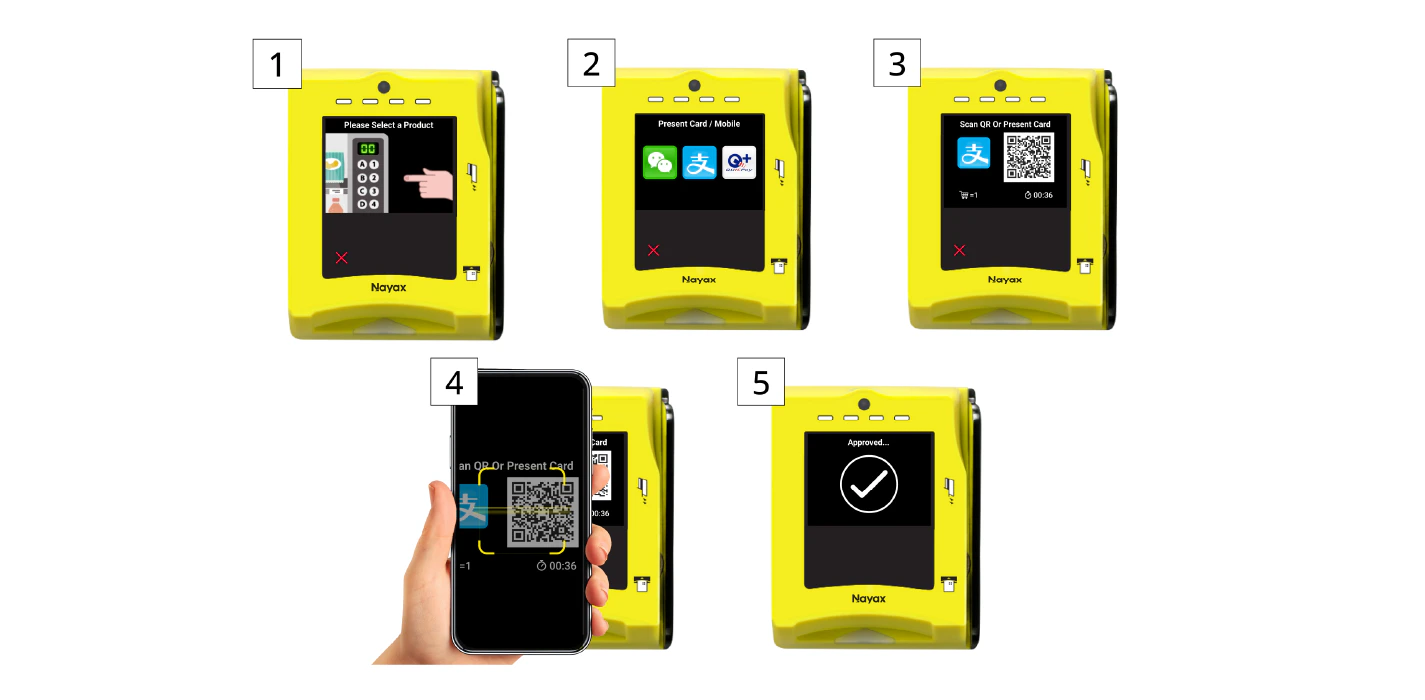 - Once the user scans the QR and confirms via mobile, the Vending Machine sends a QR Payment Command Request to the Nayax Server.