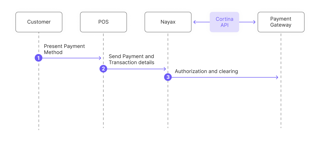 - Nayax: Nayax receives the payment request and uses the Cortina API to verify the transaction. The API handles the transaction’s authentication, authorization, and final settlement.