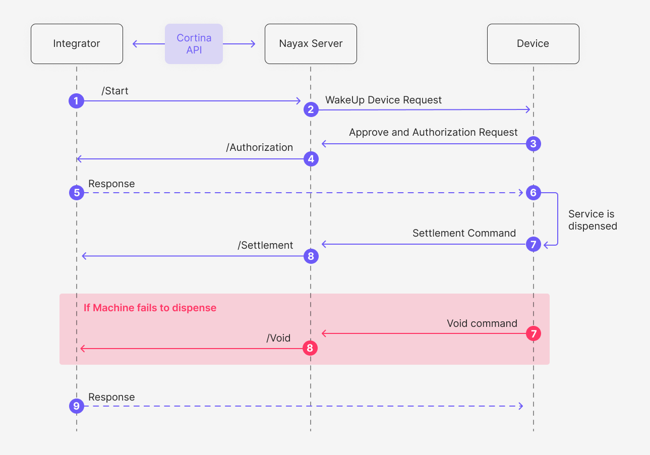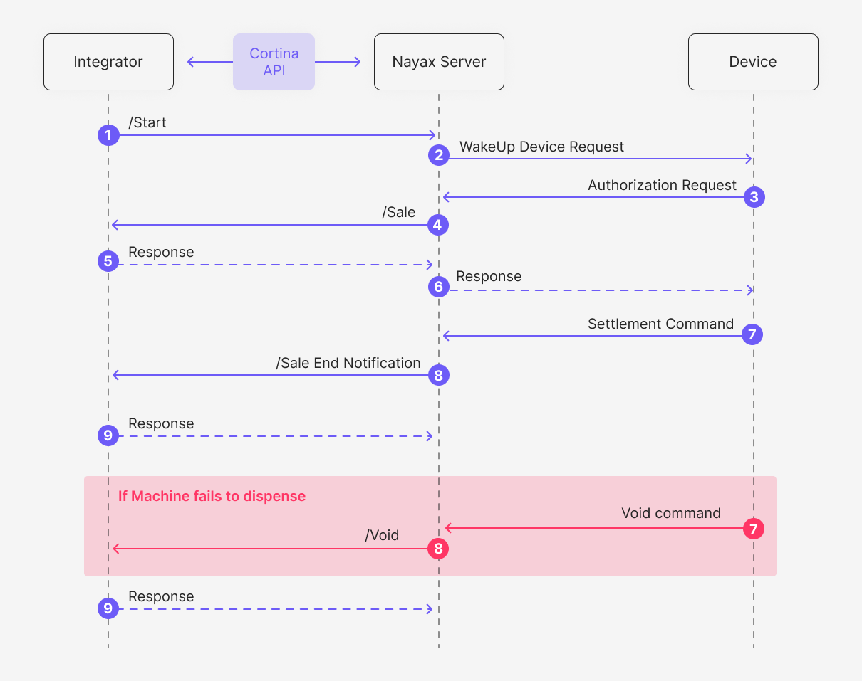 - The Nayax server forwards the Settlement Request to the integrator using Cortina’s API Sale End Notification endpoint, with the final transaction amount to be settled.