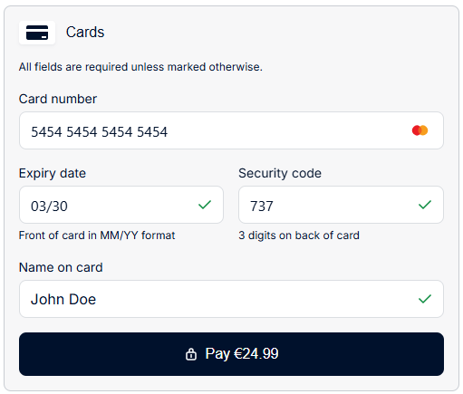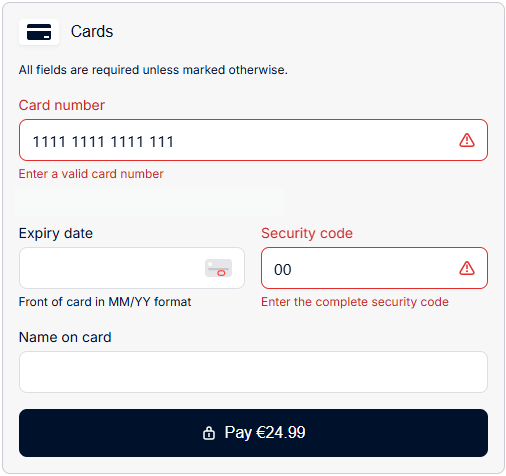 If the consumer enters incorrect information in the fields, the drop-in UI performs a validation check and informs them of the errors. See the example below: