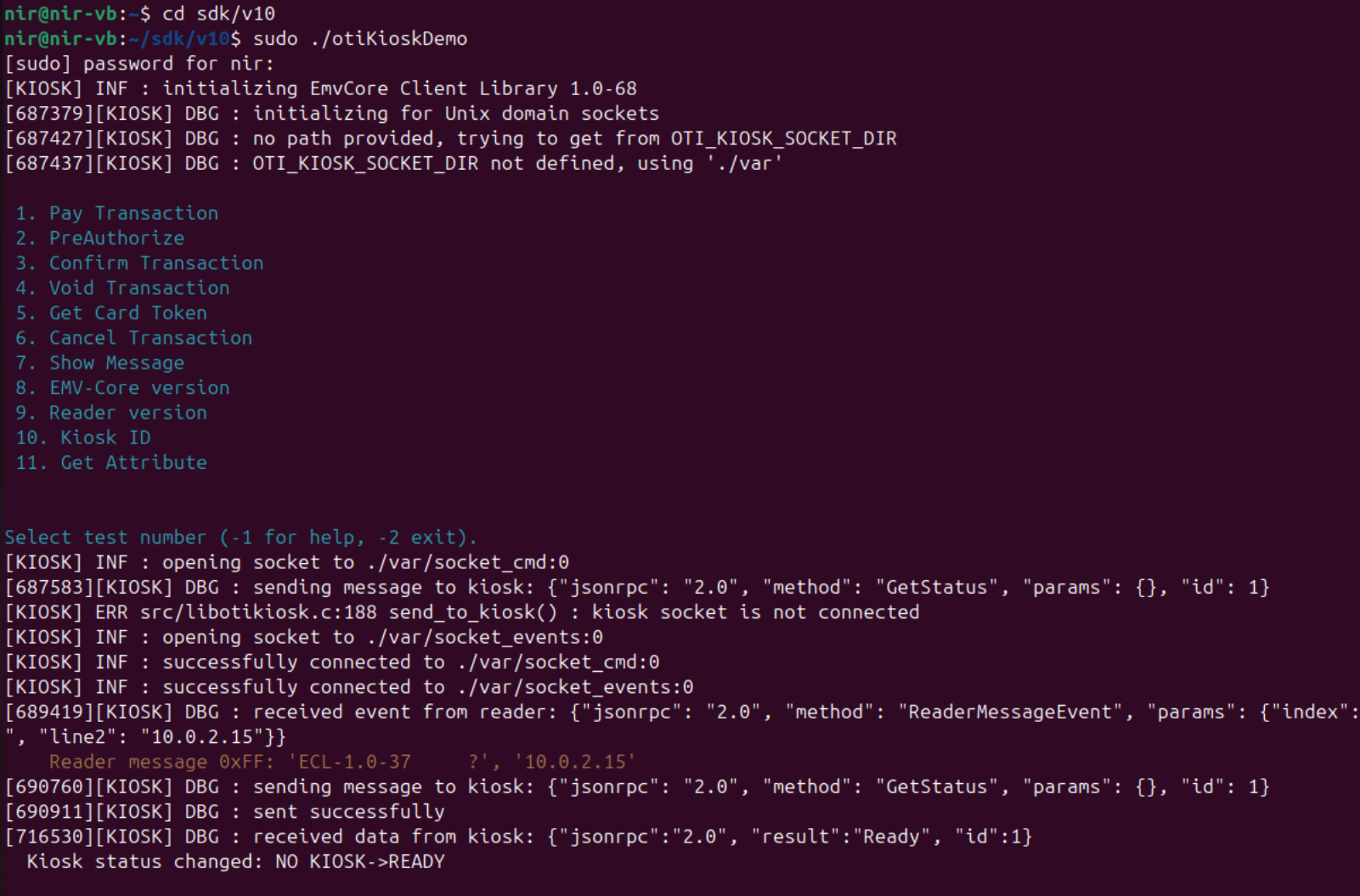 To run the test application executable on Ubuntu:- Start the EMV Core (otiKiosk) as explained in the previous section.