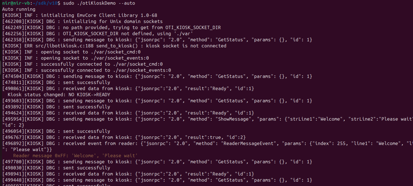 - Run the otiKioskDemo sample application from the same folder as the EMV-Core binary (do not navigate into the demo application folder itself).
