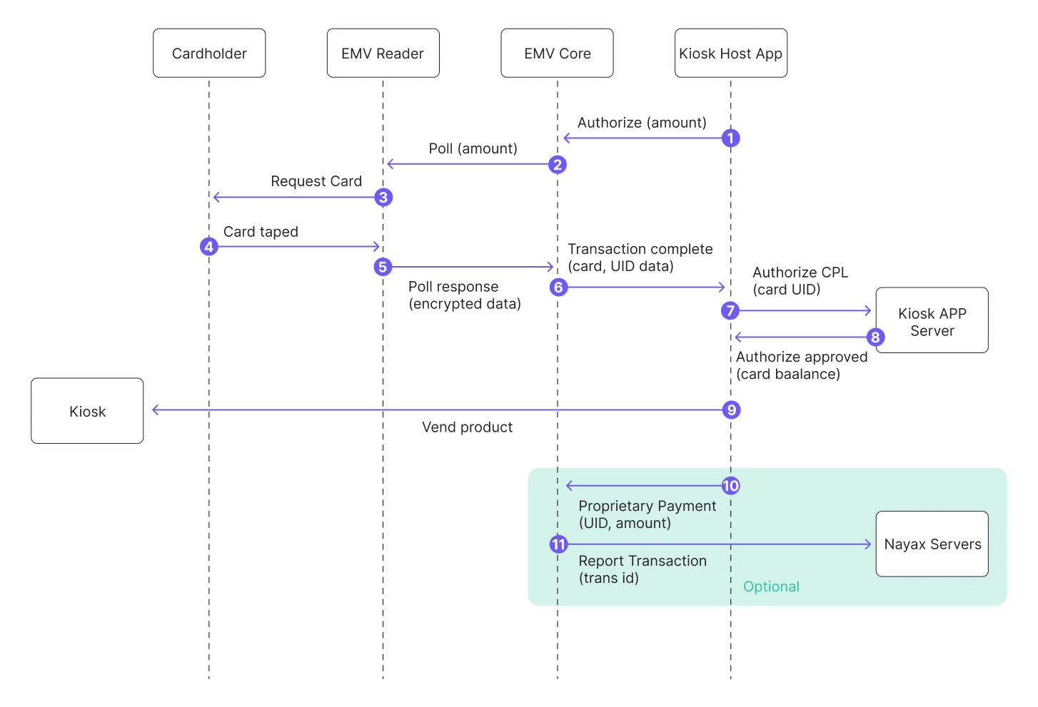 - EMV Core allows transactions to be reported to the Nayax server, which sends the proprietary payment amount and UUID.