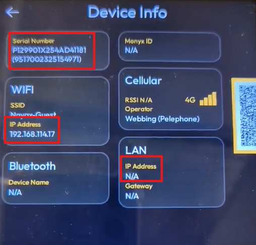 In this example, the device has an eSIM (as in this example, it’s VPOSM 4S, which will always have an eSIM,) and it’s also connected to WIFI, so you can see that it’s connected to the WIFI and the device’s IP address: