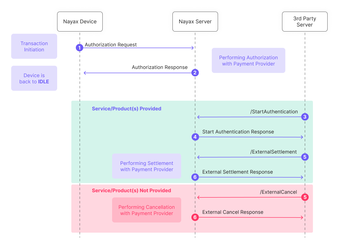 - Authorization Response: The Nayax Server performs authorization with the payment provider and sends the response back to the device, which then returns to an IDLE state. The transaction remains authorized but unsettled.