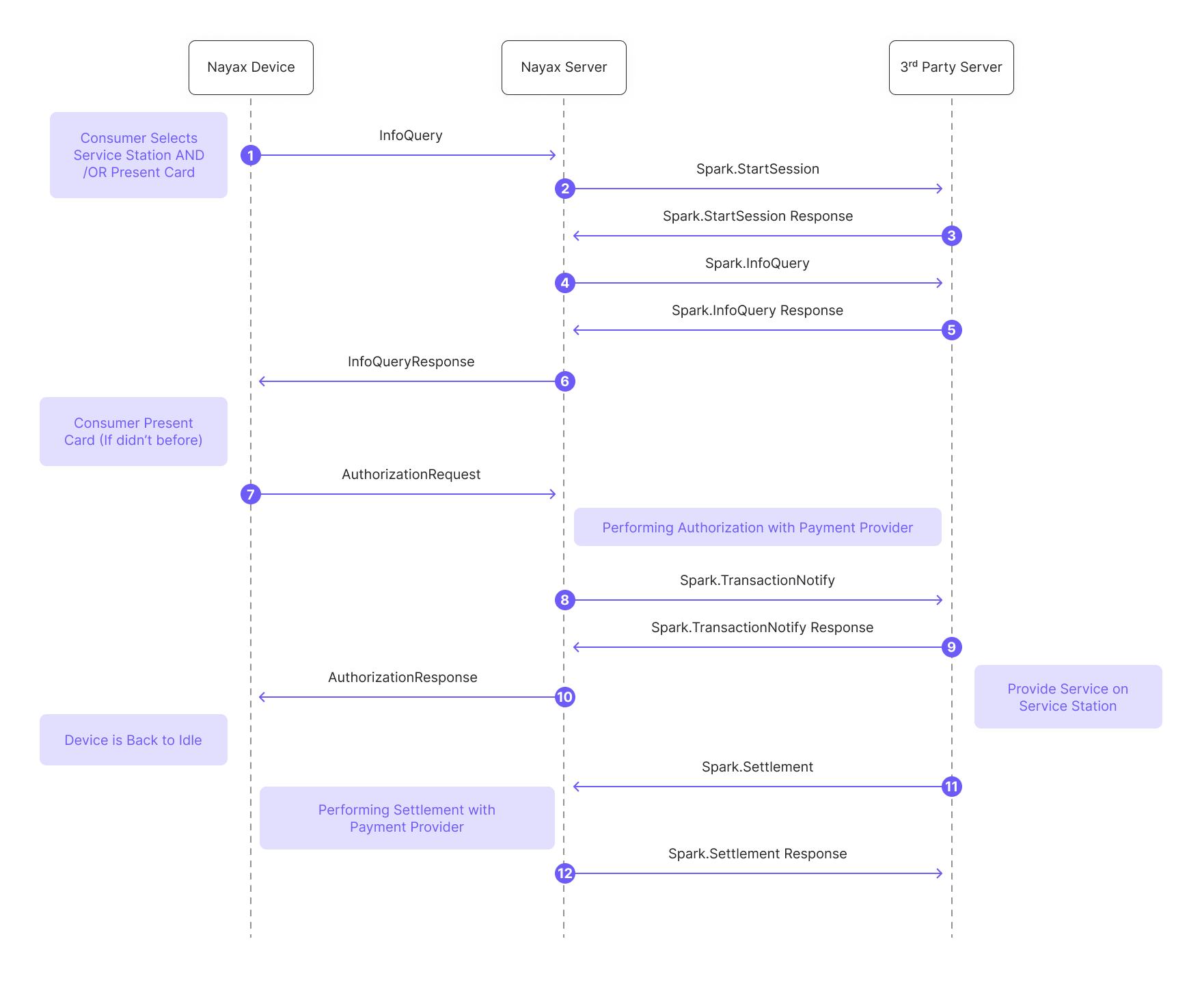 AuthorizationResponseBack to the Nayax Device. At this point, the service can be provided on the Service Station, and the Nayax Device is back to idle. - The 3rd Party Server sends a