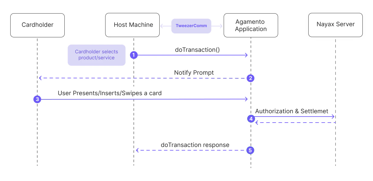 doTransactionRequest to the Agamento Application. - The application then displays a prompt for the cardholder, requesting him to insert or swipe a card.