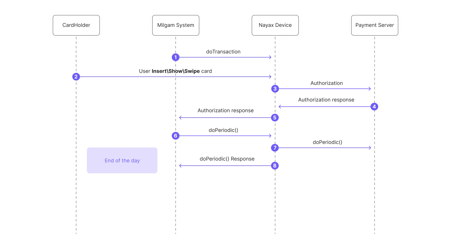 doTransactionrequest to the Nayax Device. - The Nayax Device prompts the CardHolder to present their card by inserting, showing, or swiping it.