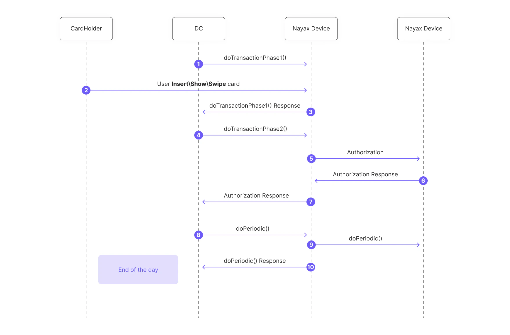 Completion result, which the Nayax Device sends back to the POS. - At the end of the day, the POS sends a
