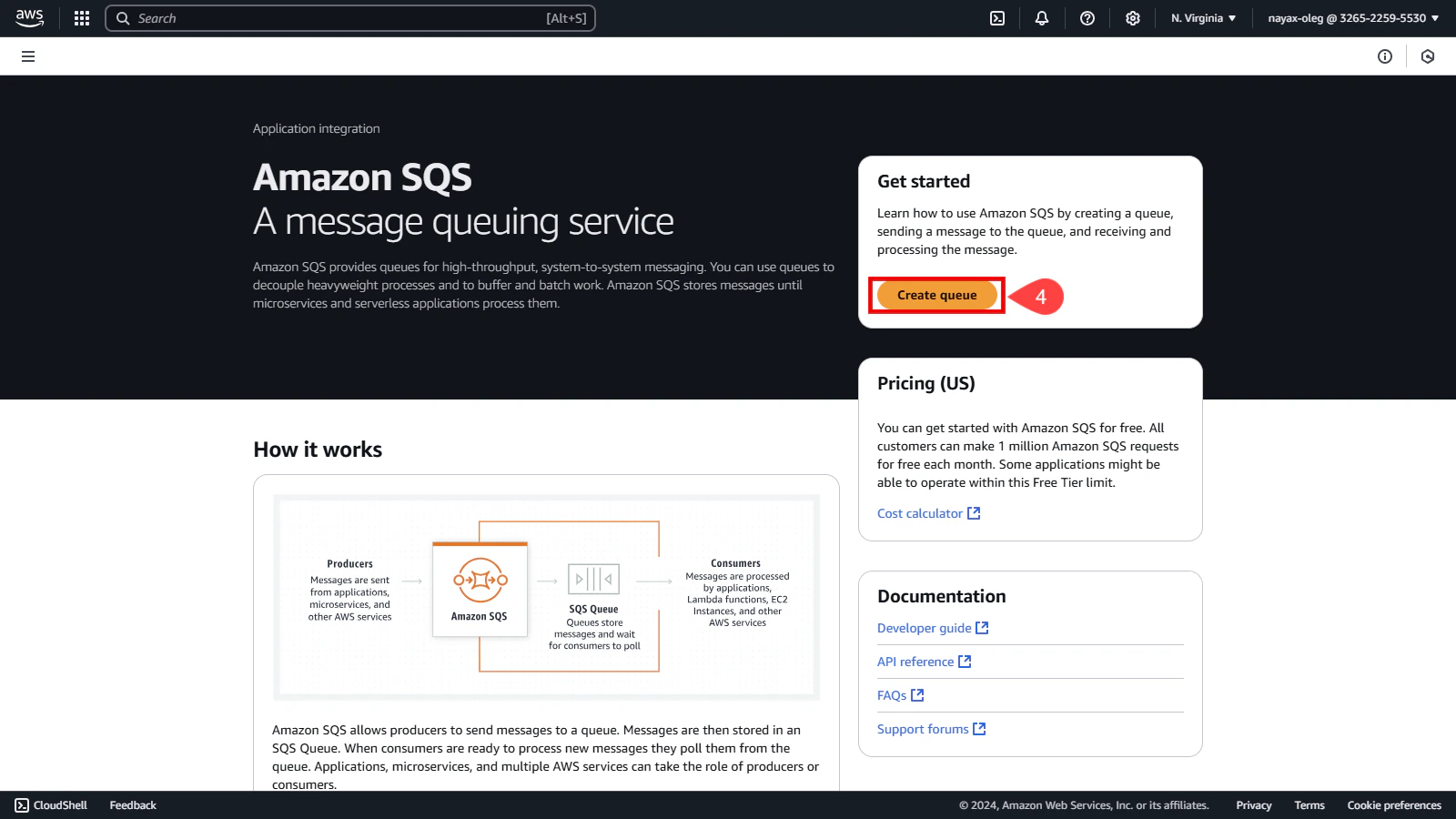 Once the prerequisites are complete, you can proceed to select the AWS region where your queue will be created.- Go to the top-right corner of the AWS console.