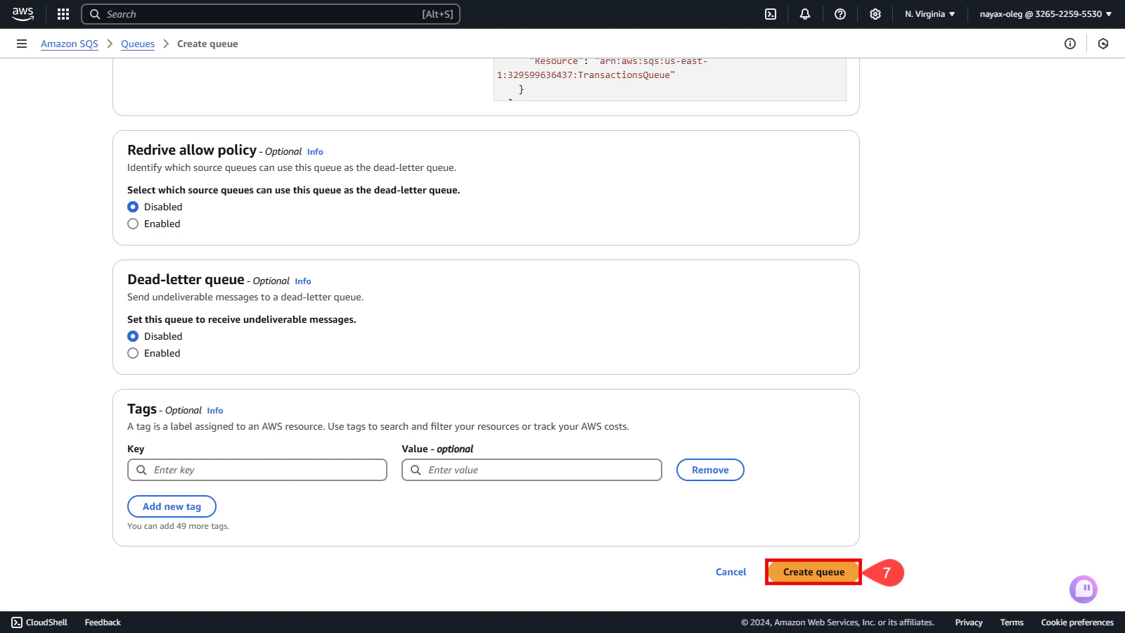 Optional SectionsOptional sections such as Redrive allow policy, Dead-letter queue, and Tags should be filled in based on your specific requirements. They help customize your queue’s functionality and management.