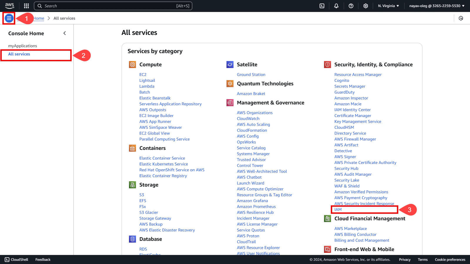 Search the Security, Identity, & Compliance category and select IAM (Identity and Access Management).