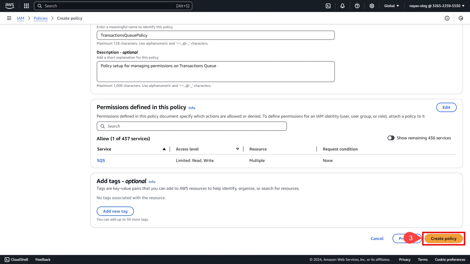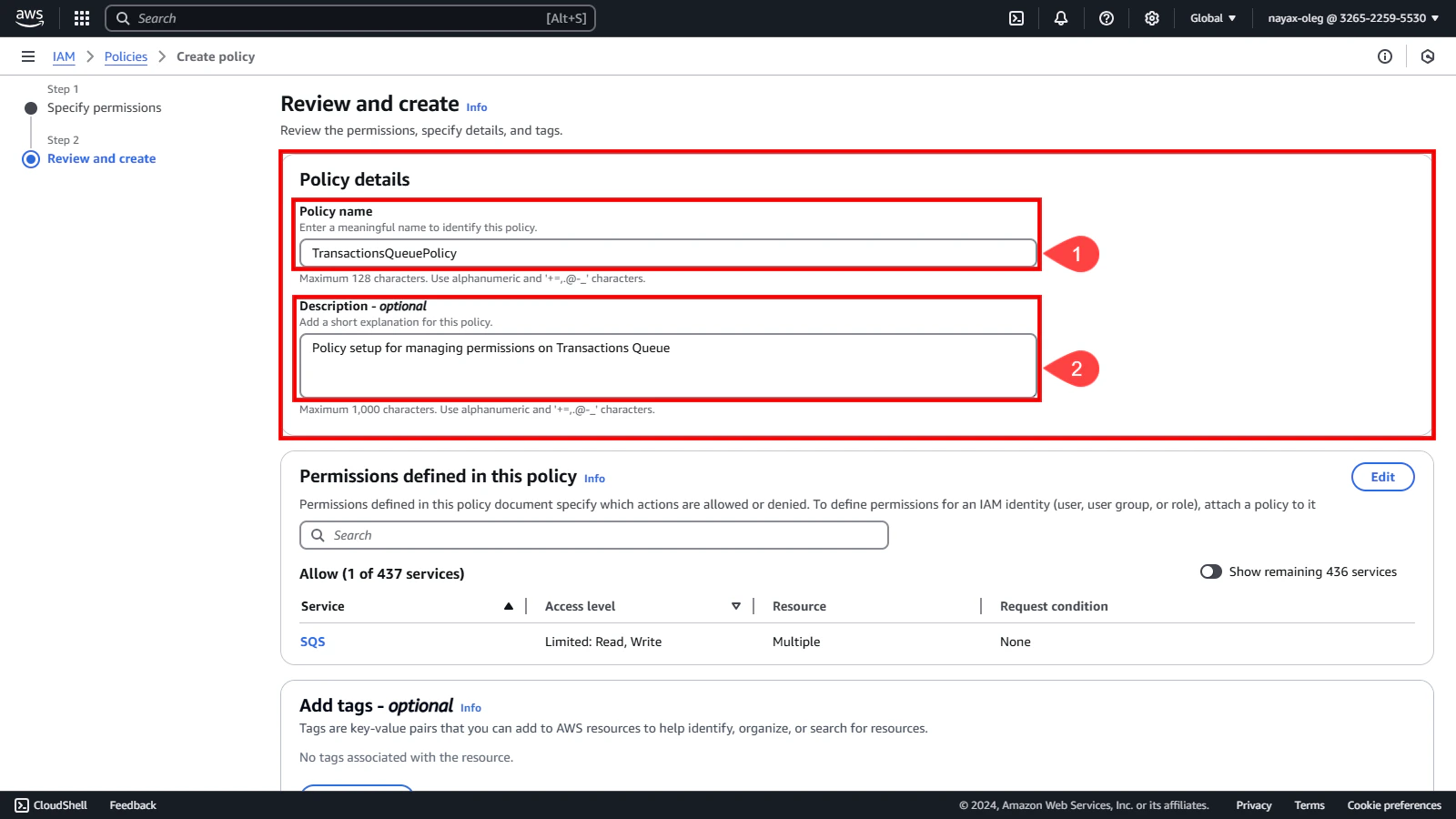 Before finalizing the policy, review its details to ensure all configurations are correct. This step is essential to avoid potential issues with permissions. In the Policy details section:- Enter a unique name to identify this policy.