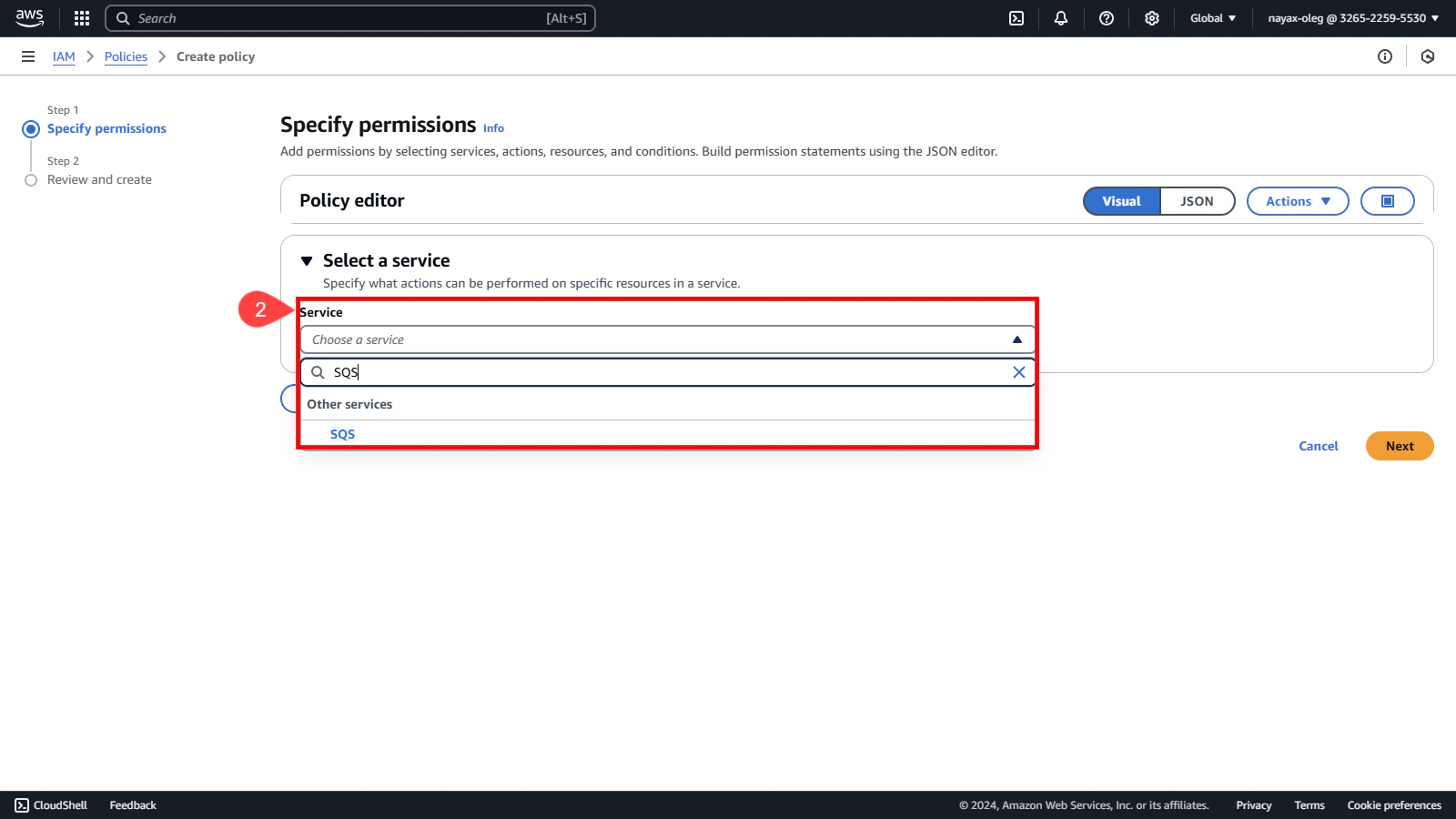 In the Service Choose a service field, search and select SQS.
