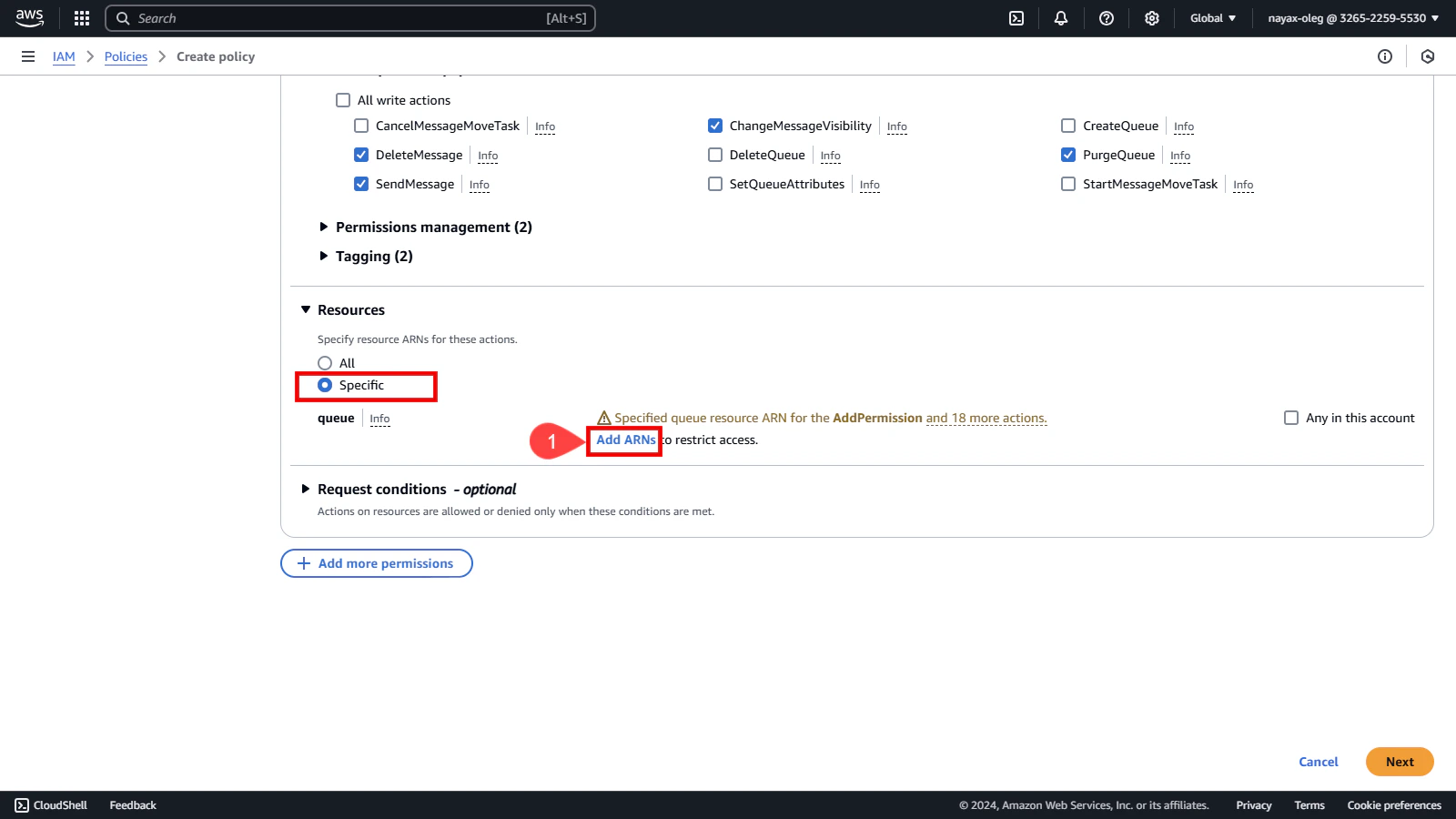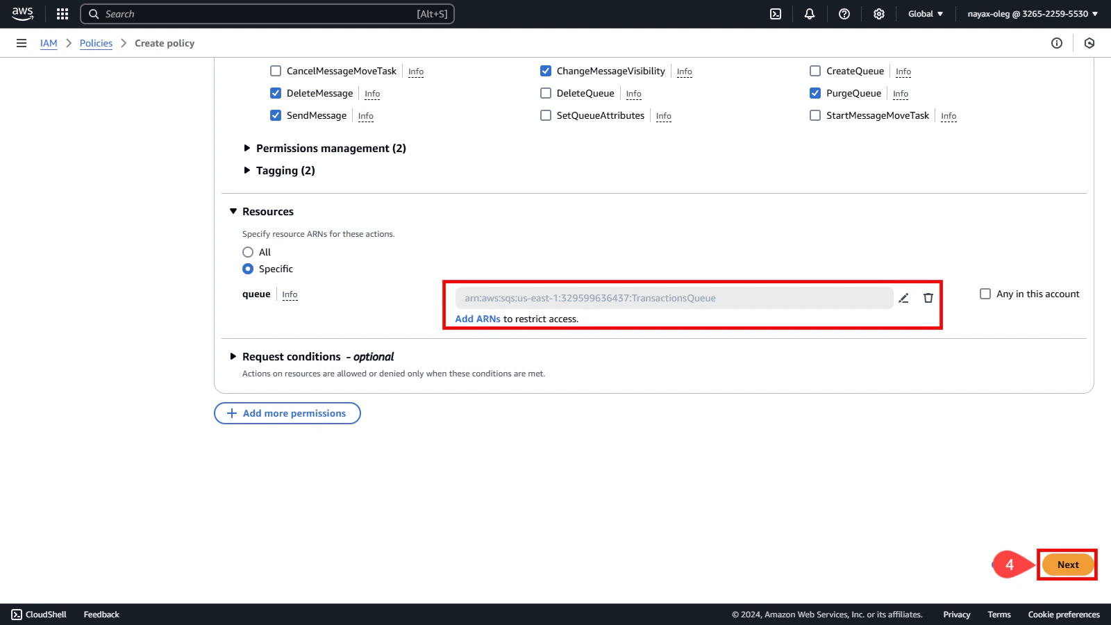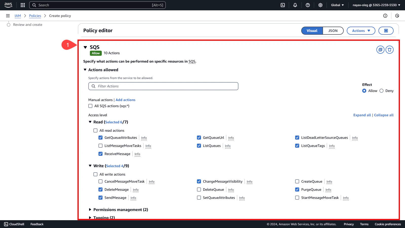 Now that you’ve selected SQS as the service define the permissions needed for the queue:-