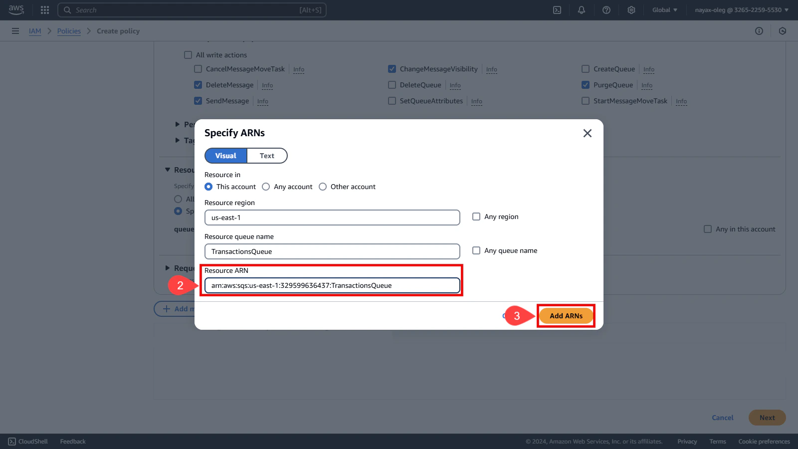 - Enter the copied ARN in the Resource ARN field. You can find this value from the confirmation screen displayed at the end of the Create New Queue process.
