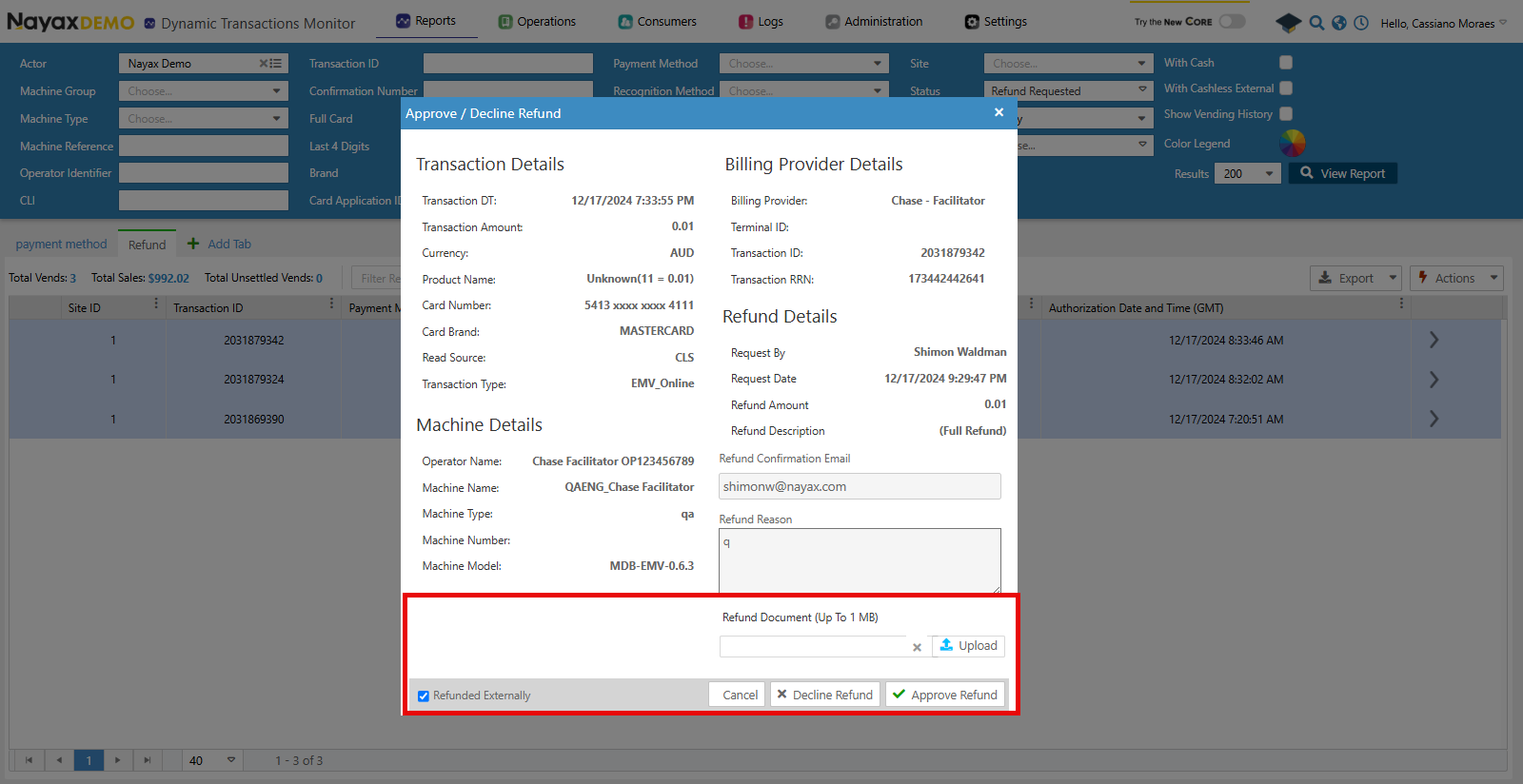 In Nayax Core, this is set when accepting or declining a refund by selecting Refunded Externally. You can upload the refund document. See the image below: