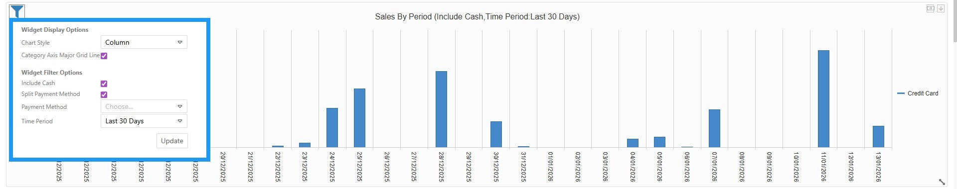 - Legend: Categorizes sales by payment method. In this view, it is tracking Credit Card transactions (indicated by the blue bars).