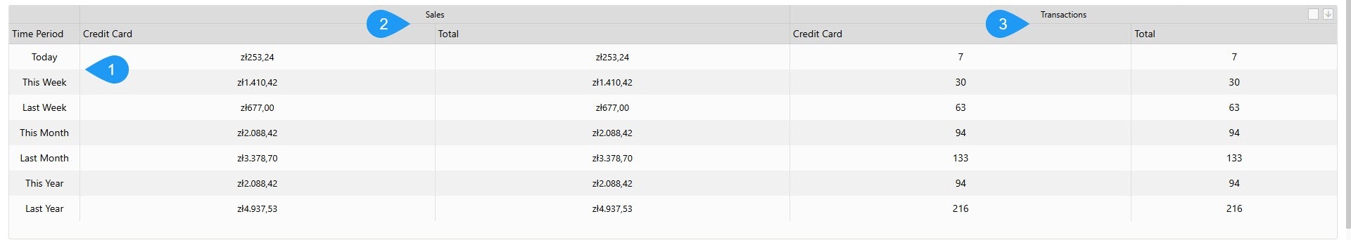 - Sales: Shows the monetary value earned, categorized by payment method (e.g., Credit Card) and a total for that period.