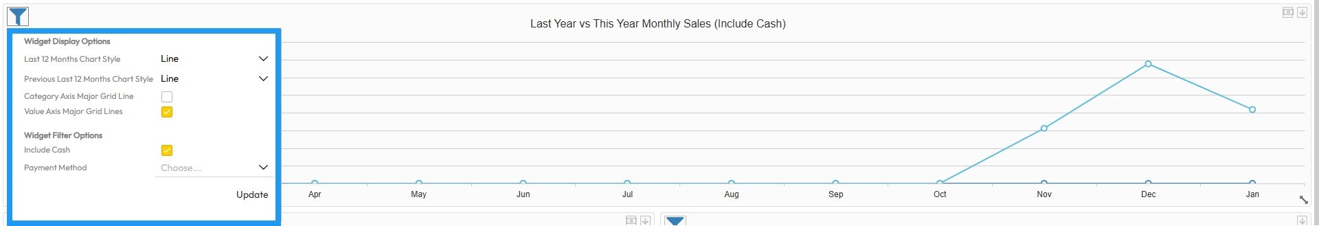 The Last Year vs This Year Monthly Sales widget provides a high-level visual comparison of sales performance across two years. It helps operators track long-term business growth and seasonal trends.