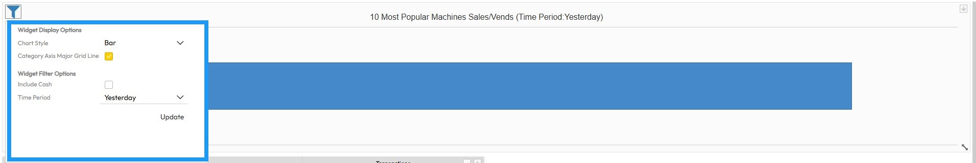 This is a list of all documented widgets:- Sales By Period: Shows machine revenue across a specific time period